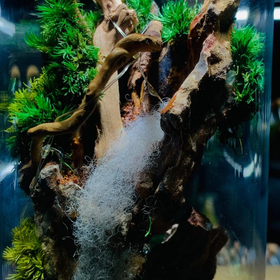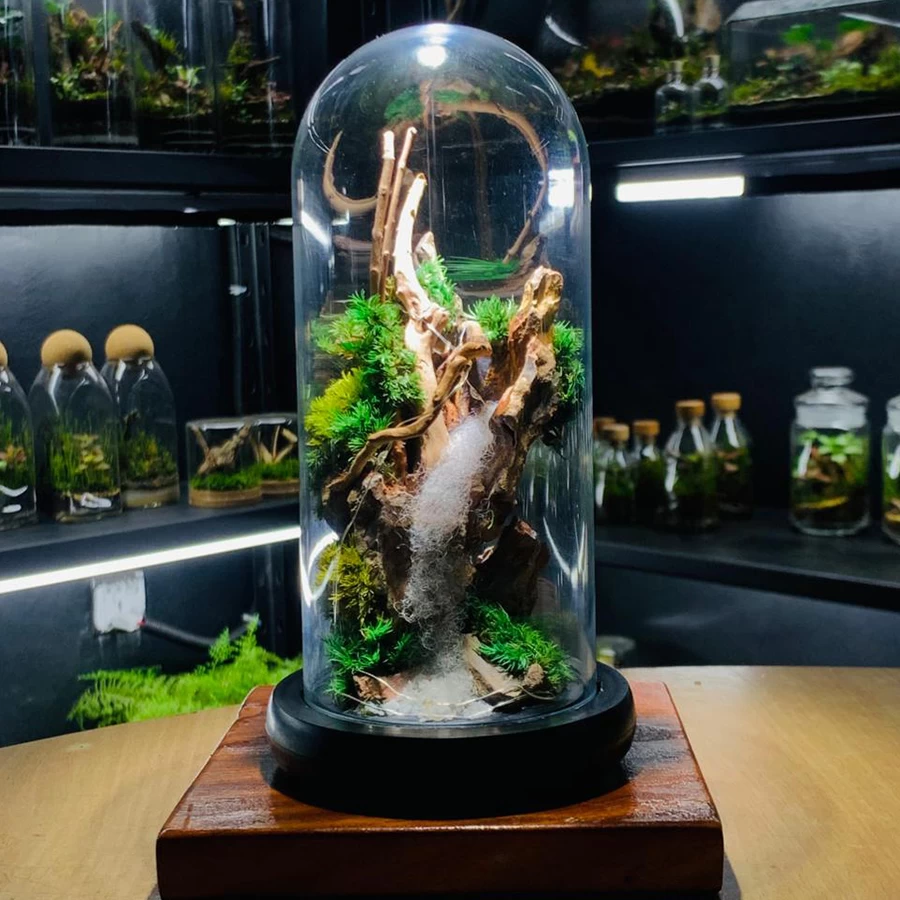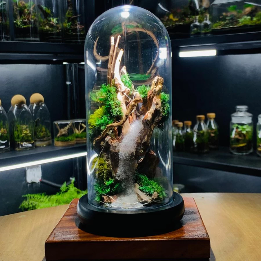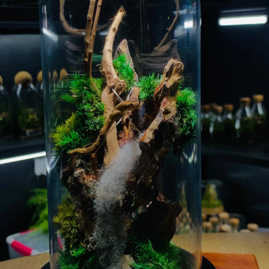 preserved moss, driftwood, stones and natural textures—creating a sealed,