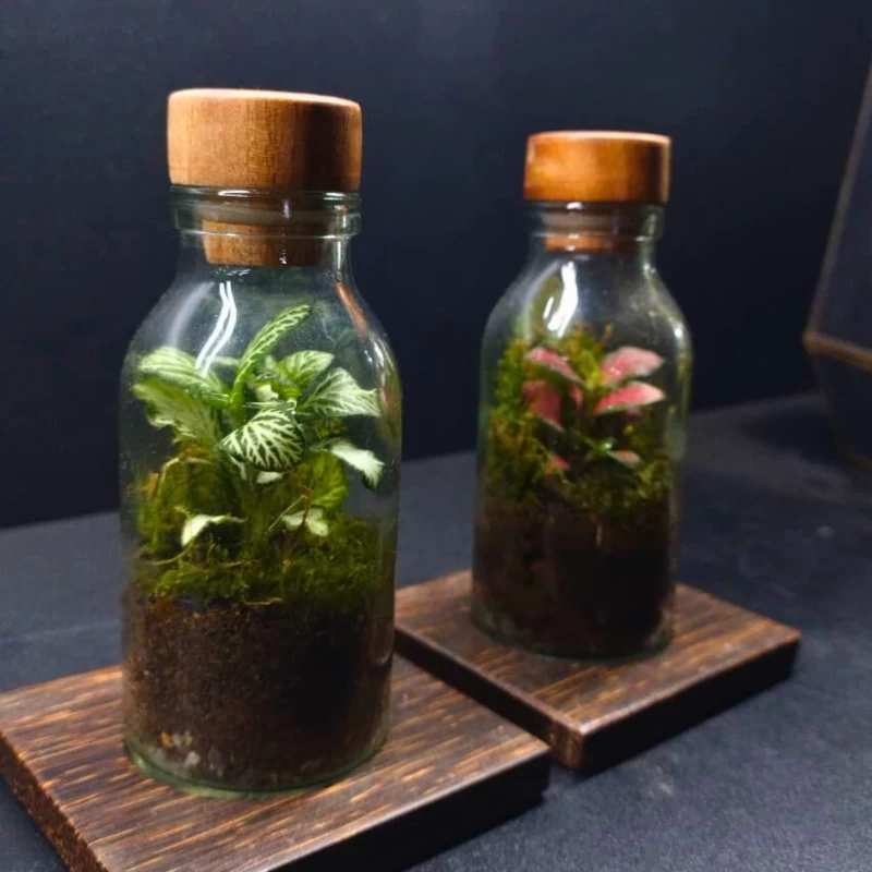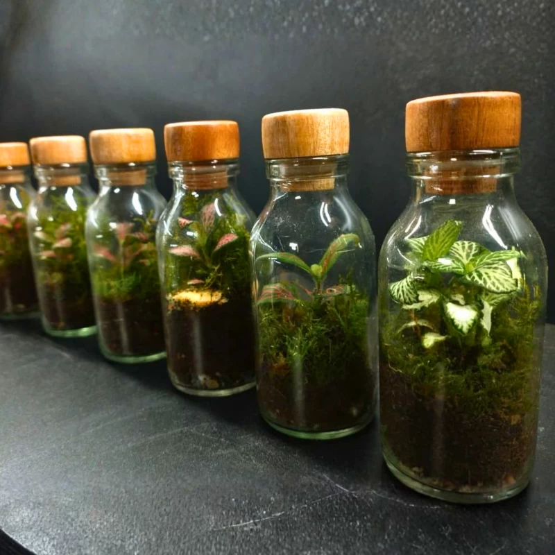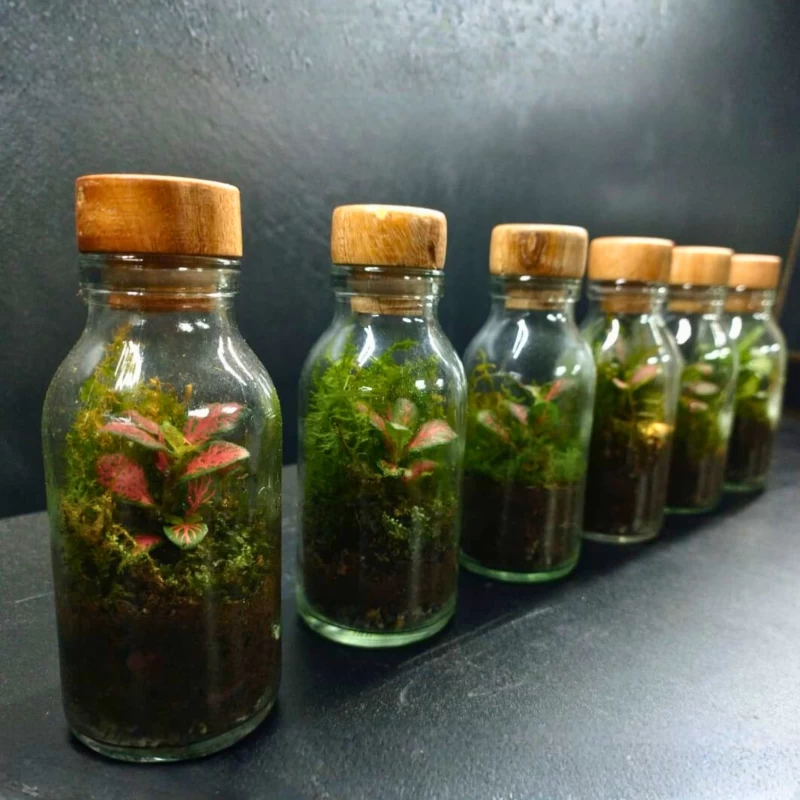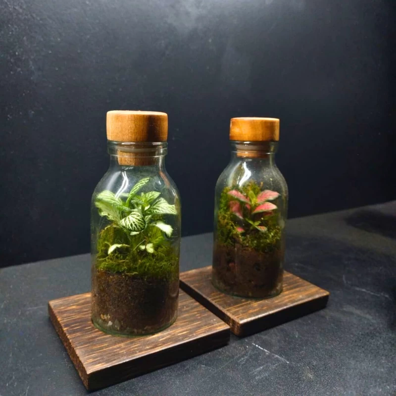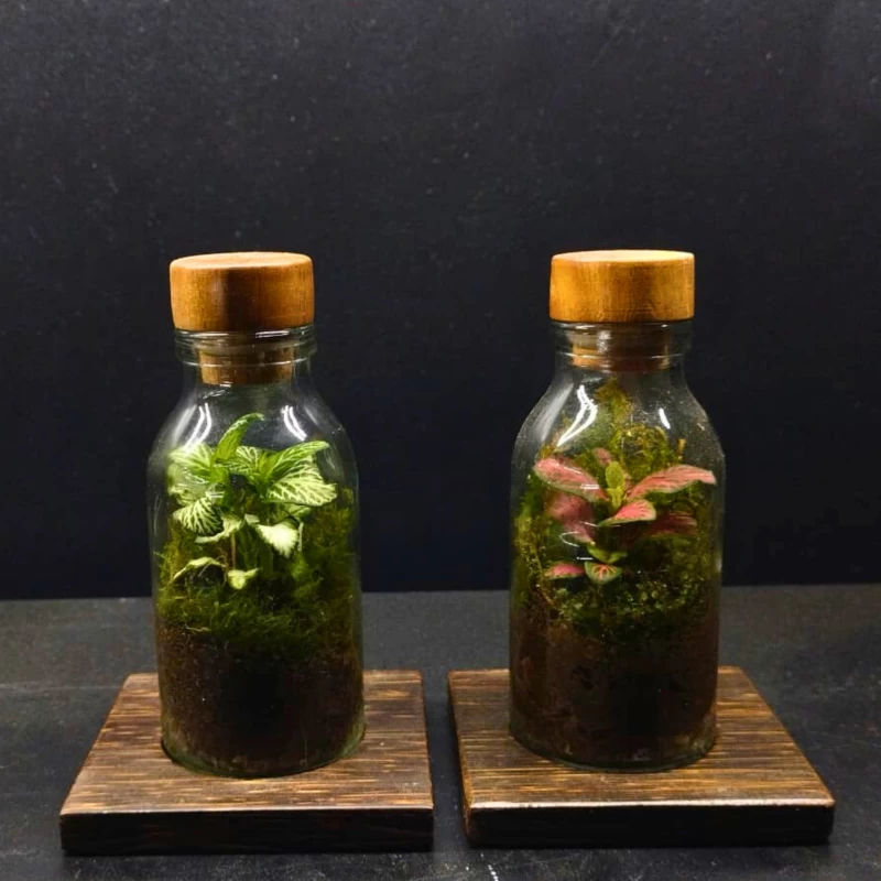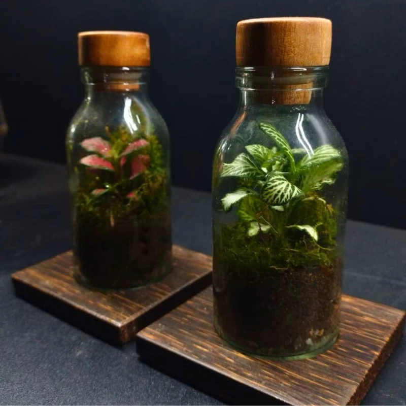 miniature ecosystem featuring live moss and fittonia inside a stylish