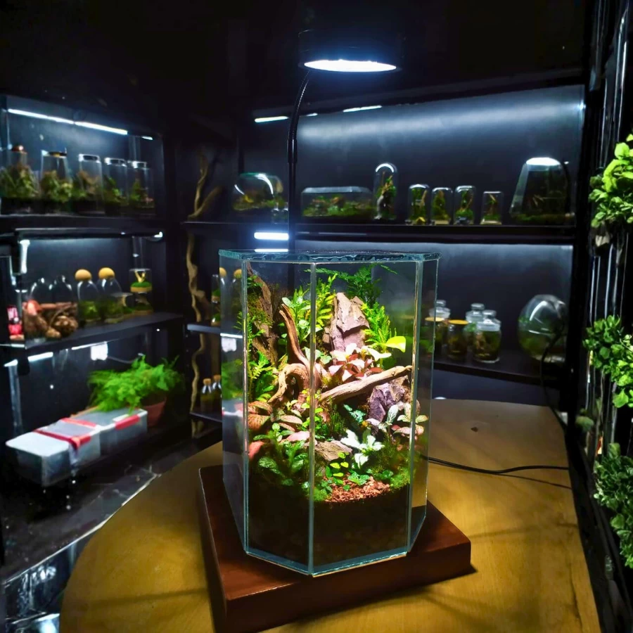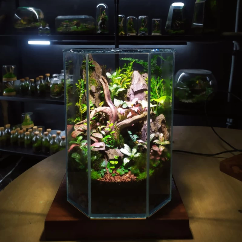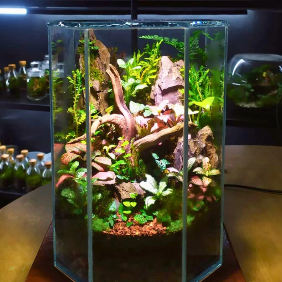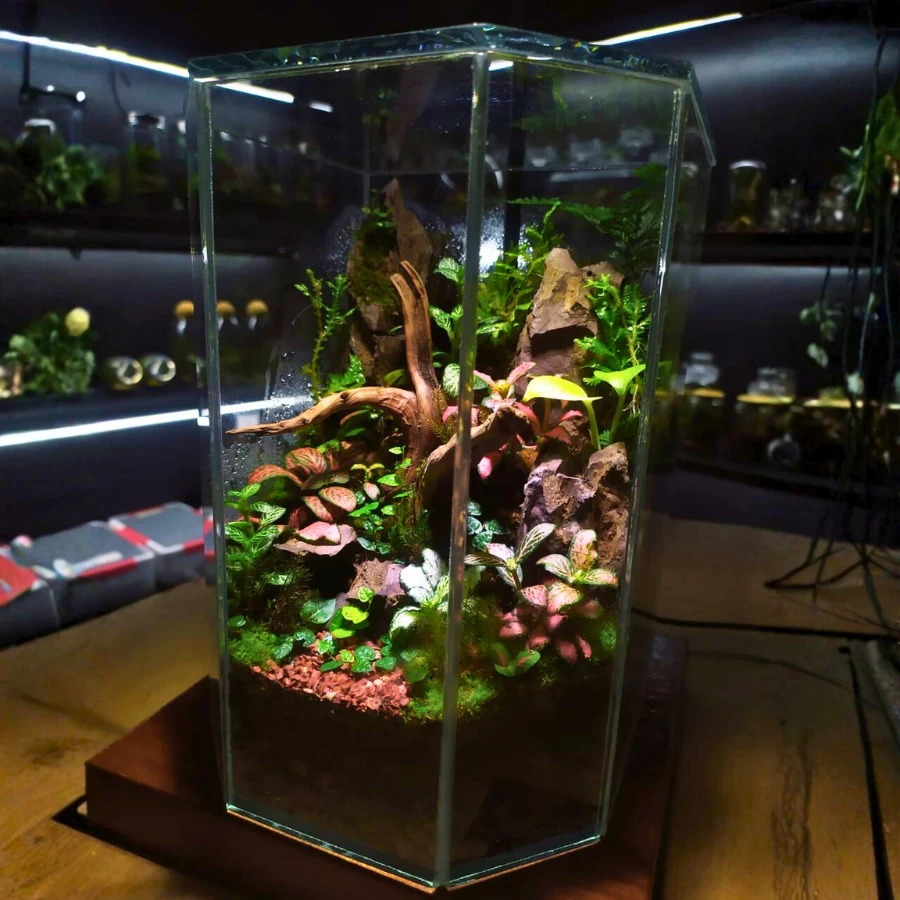 miniature rainforest inside crystal-clear hexagonal glass. Perfect as a