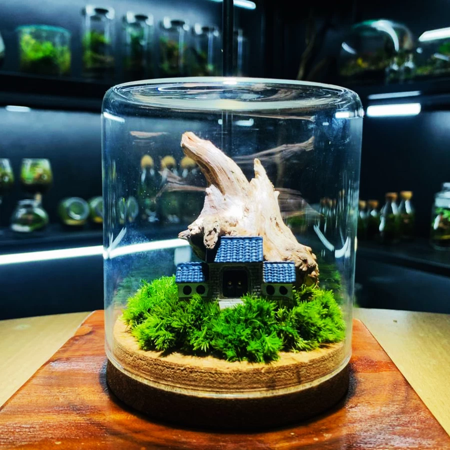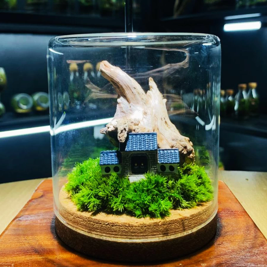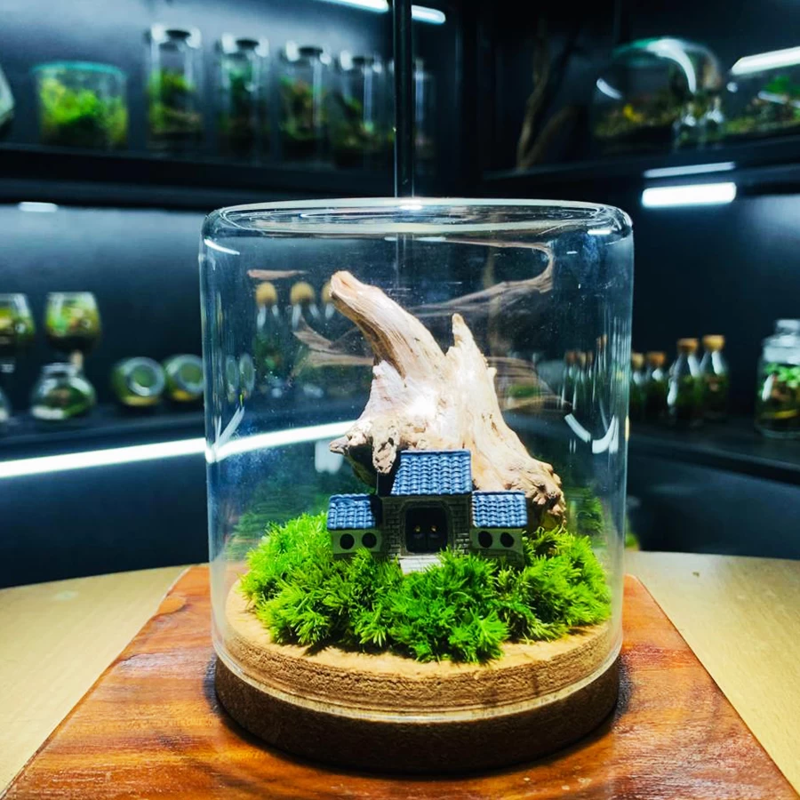 décor piece featuring a miniature house set on a lush preserved moss landscape